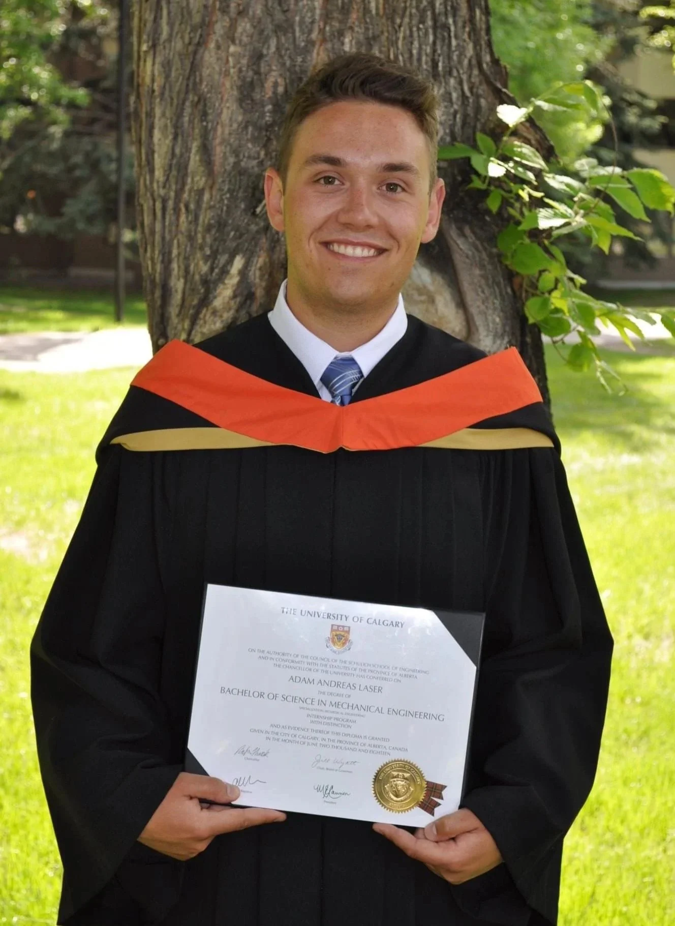After graduating high school, Adam was accepted into the Faculty of Engineering at University of Calgary. Once again, Adam navigated the world of academia with ease. His success at university can also be attributed to the friendships he developed. Adam deeply valued his relationships with these young men and the adventures that followed. In 2018, he graduated with distinction, with a Bachelor of Science Degree in Mechanical Engineering with a specialty in Biomedical Engineering.